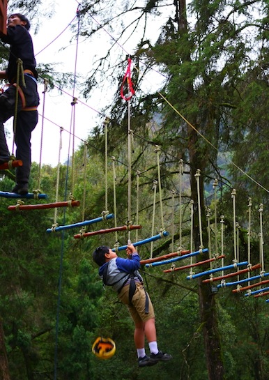 This children and his helmet felt down from this hanging bridge rope game. He is okay. Instructors help him in a minutes. Location is on Bumi Sanctuary Ciwidey Bandung.