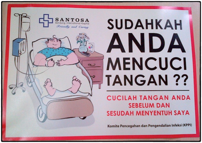 Have you wash your hand? Wash your hand before and after you touch me. This message I found at Santosa Hospital Bandung.