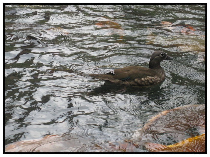 This duck swims on the pond without fear surrounding by a lot of fish.