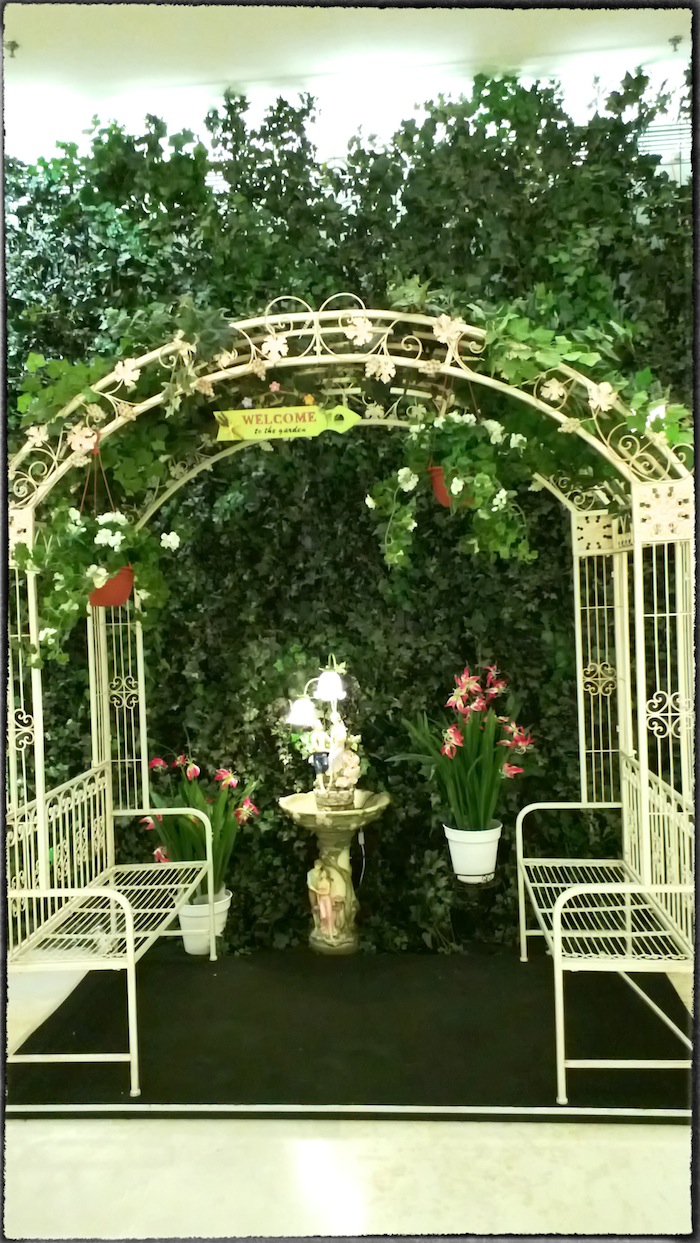 I was visiting Kota Kasablanka Mall, Jakarta. There was an under construction store. In front of it they put a nice garden to distinguish the construction. Also, they put direction signage in that small garden. Nice Idea.