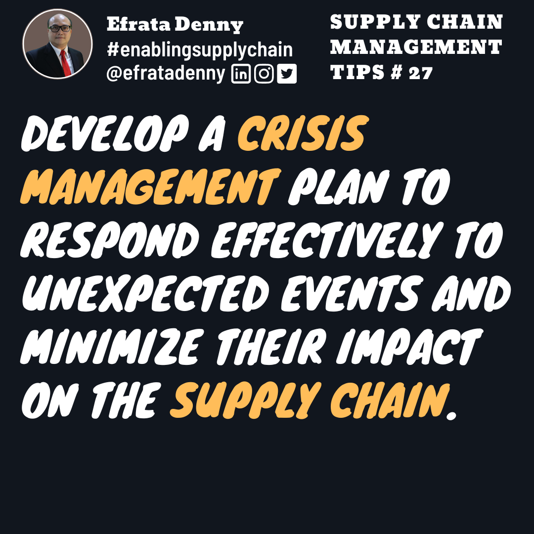 “Develop a crisis management plan to respond effectively to unexpected events and minimize their impact on the supply chain.” – Efrata Denny
