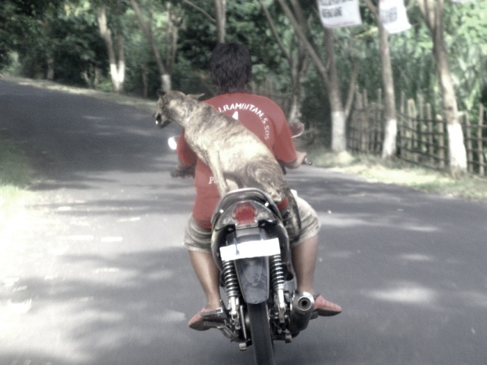 This photo was taken from my car in Manado, Indonesia. On my way home after diving at Bunaken, I saw this dog gets a ride on motorcycle behind the rider. This dog become the king of the road. Every eyes on him at that time.ย This dog can keep his body balance during although the motorcycle move fast. Amazing.