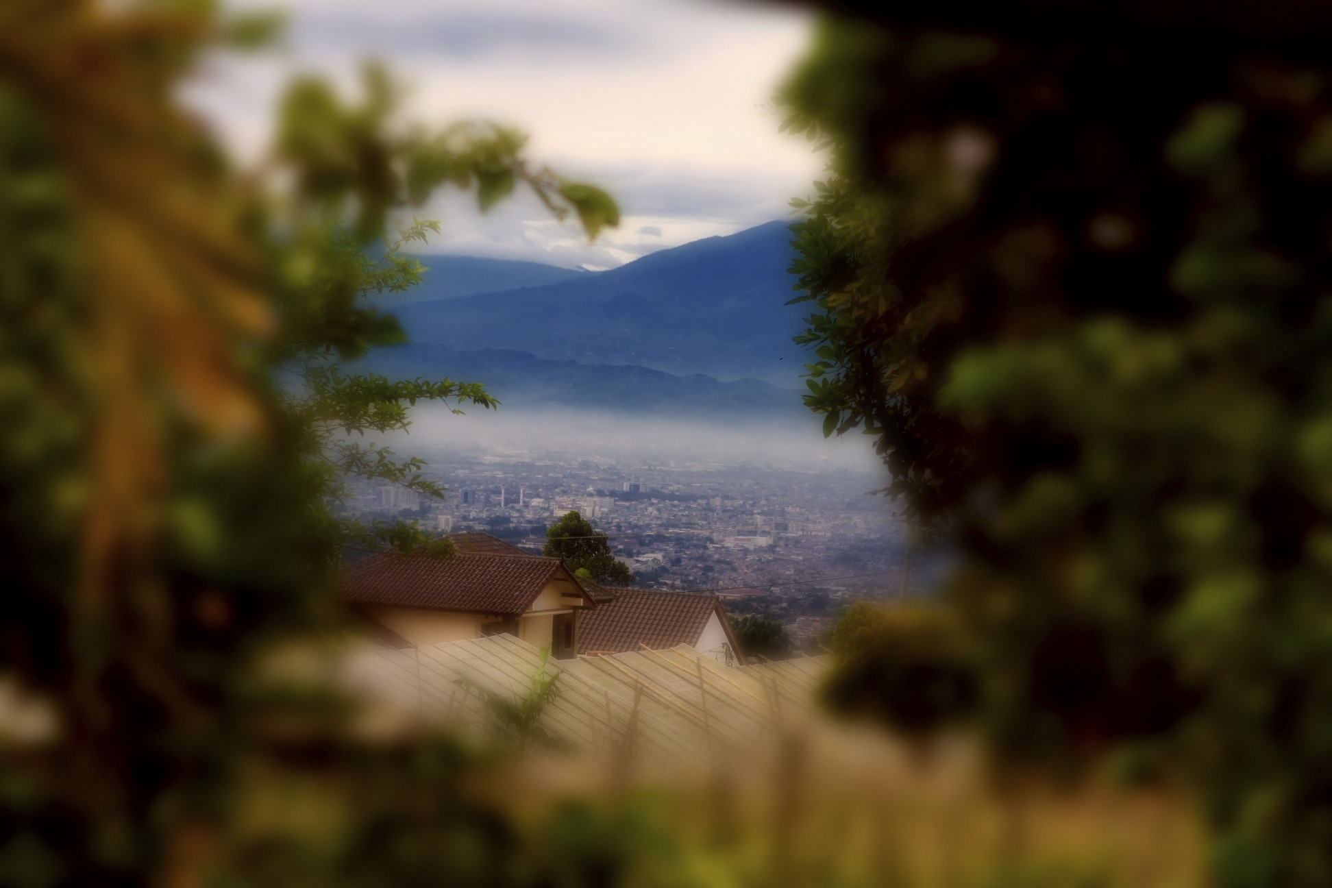View of Bandung City from Dago Pakar high ground. In this photo Bandung framed with leaves, trees, houses, and mountain.