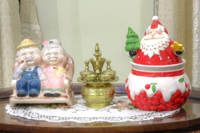 This is Santa figure on my desk. I also put grandpa and grandma figure next to Santa. Happily ever after. Both of them are clay figure. In the middle, that is small pestle and mortar figure made by brass. Very unique.