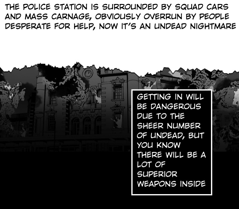 The police station is surrounded by squad cars and mass carnage, obviously overrun by people desperate for help, no it’s an undead nightmare. Getting in will be dangerous due to the sheer number of undead, but you know there will be a lot of superior weapons inside.